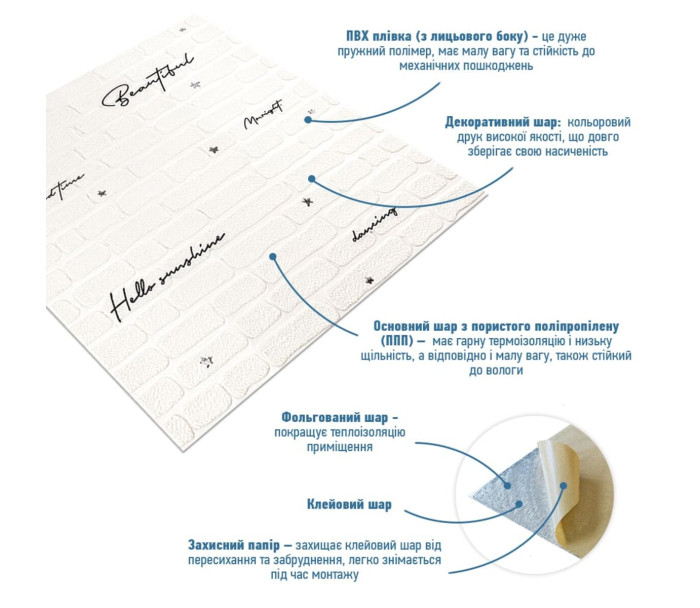 - Легкість монтажу: наявність клейового шару дозволяє встановити панелі без необхідності застосування додаткових матеріалів.