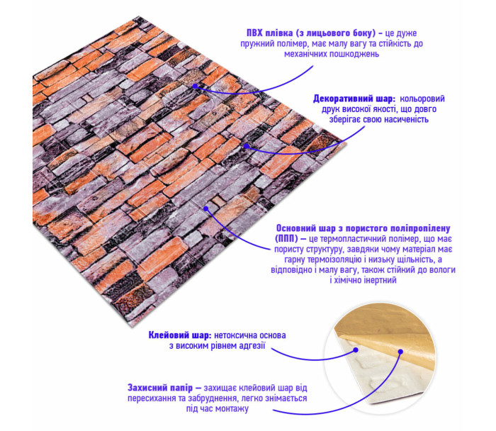 3D панелі самоклеючі – декоративне покриття для стін, виконане з легкого та міцного матеріалу – пористого поліпропілену (ППП). Основна особливість – рельєфний малюнок у вигляді цегли у широкому різноманітті кольорів та наявність клейового шару, що дозволяє встановити панелі без необхідності застосування додаткових матеріалів.