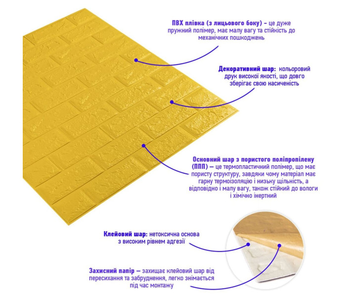 - Легкість монтажу: наявність клейового шару дозволяє встановити панелі без необхідності застосування додаткових матеріалів.