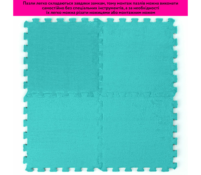 Простота монтажу. Пазли легко складаються завдяки замкам, які забезпечують надійне з'єднання між окремими елементами. Це дозволяє швидко створювати підлогове покриття будь-якої форми та розміру, без необхідності використання додаткових інструментів або спеціальних навичок. Монтаж пазлів можна виконати самостійно, без спеціальних інструментів, а при необхідності їх легко можна різати ножицями або монтажним ножем.
