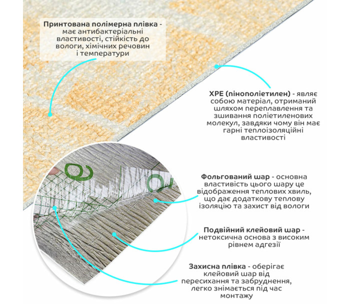 3. Теплоізоляція: Спінений ХРЕ і фольгований шар забезпечують хорошу теплоізоляцію, що допомагає підтримувати комфортну температуру в приміщенні.