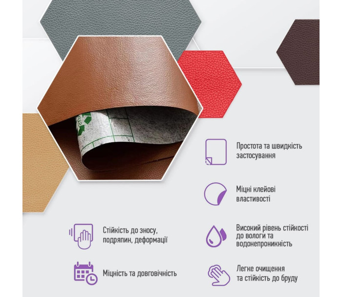 - Екологічна перевага: самоклейна екошкіра виготовляється без використання тваринного шкіряного матеріалу, тому вона є більш екологічною альтернативою натуральній шкірі.