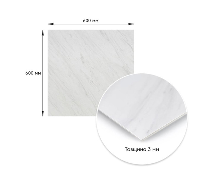 Розмір ПВХ плити - 600ммх600мм. Товщина - 3 мм. Вага листа - 2,4кг