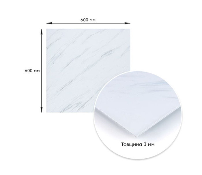 Розмір ПВХ плити - 600ммх600мм. Товщина - 3 мм. Вага листа - 2,4кг