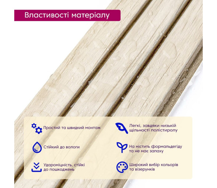Стінова рейка є елементом для обробки внутрішніх стін в інтер'єрі, має зовнішній вигляд, що імітує текстуру дерева.