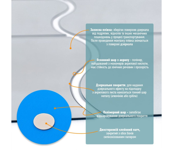 - Дзеркальний шар: це тонке металізоване або полімерне покриття, яке наноситься на акрилову основу та створює ефект дзеркального відбиття. Воно має гладку, світловідбивну поверхню, стійку до вологи та зношування. Завдяки гнучкості матеріалу відображення може незначно викривлюватися.