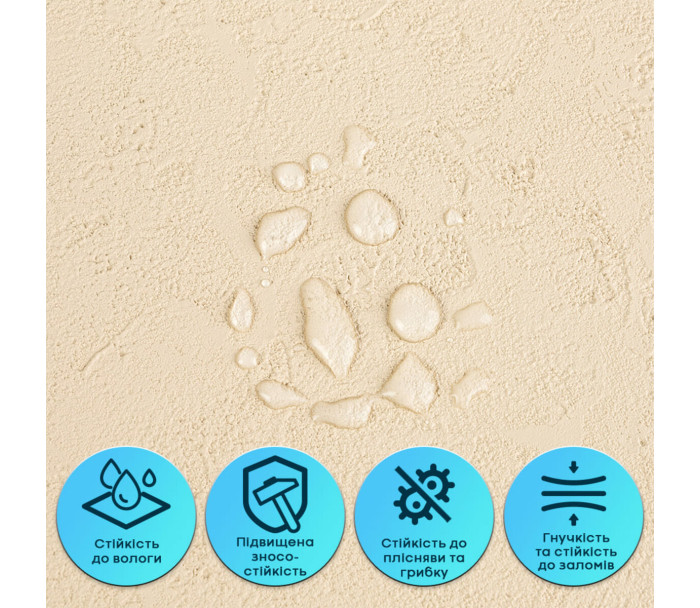 • Стійкість до вологи та пари Гнучка штукатурка не вбирає воду, не набухає та не деформується під впливом вологи. Матеріал стійкий до пари, не сприяє утворенню плісняви та підходить для приміщень із підвищеною вологістю — кухонь, ванних кімнат. Може застосовуватися в зоні кухонного фартуха (за умови відступу від плити на 25-30 см).