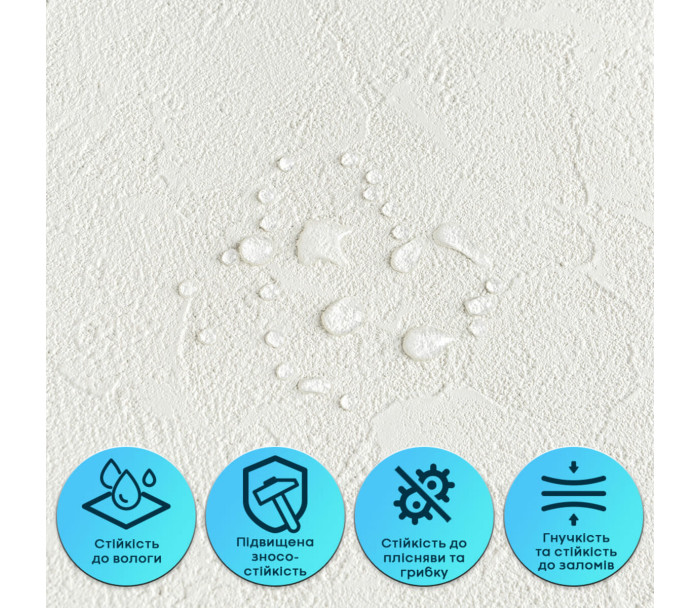 • Стійкість до вологи та пари Гнучка штукатурка не вбирає воду, не набухає та не деформується під впливом вологи. Матеріал стійкий до пари, не сприяє утворенню плісняви та підходить для приміщень із підвищеною вологістю — кухонь, ванних кімнат. Може застосовуватися в зоні кухонного фартуха (за умови відступу від плити на 25-30 см).