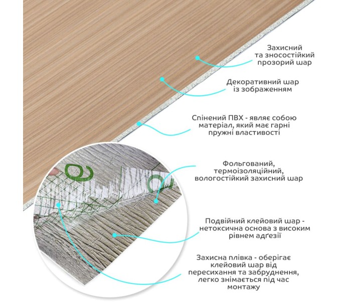 • Декоративний шар: плівка з кольоровим друком високої роздільної здатності, яка повністю імітує фактуру природних матеріалів завдяки чіткому та детальному зображенню.