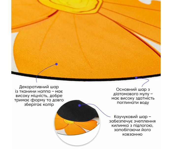 • Каучуковий шар – забезпечує зчеплення килимка із підлогою, запобігаючи його ковзанню на гладких або слизьких поверхнях.