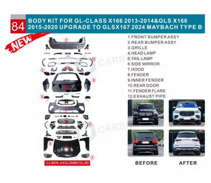 Комплект рестайлінгу з X166 в GLS X167 Maybach (Type-B) для Mercedes GL/GLS сlass X166 2012-2019 рр, Mercedes-Benz, Mercedes GL/GLS сlass X166 2012-2019 рр, Обвіси -> Комплект обвісів (повні бампера) -> Комплекти рестайлінгу (в нову модель), від виробника GBT, країна виробництво Китай, матеріал Різні матеріали, тип установки В штатні місця. Тільки якісні автоаксесуари від прямого імпортера та виробника, з гарантією та доставкою.