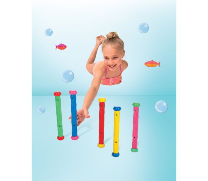 Набір з 5 підводних паличок для пірнання - чудовий спосіб зробити навчання плаванню веселим та захопливим. Яскраві гумові палички з обтяжувачем опускаються і залишаються на дні, допомагаючи розвивати координацію, спритність та впевненість у воді. Розмір – 19 см.