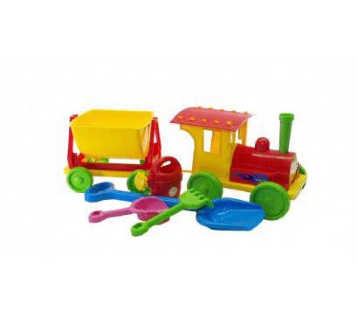 Поїзд-конструктор з причепом, в якому дитина зможе перевозити пісок або іграшки. Також, в комплекті є пісочний набір: велика лопата (50 см), лійка лопатка і граблі.