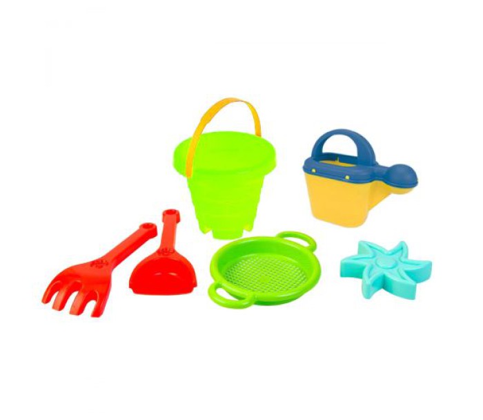 Пісочний набір "Вежа" буде цікавим подарунком для дитини. У наборі є: відерце в формі башточки, грабельки, лопатка, лійка, сито і пасочка. Виконано набір з якісного і безпечного матеріалу. Відмінно підійде для гри на вулиці.