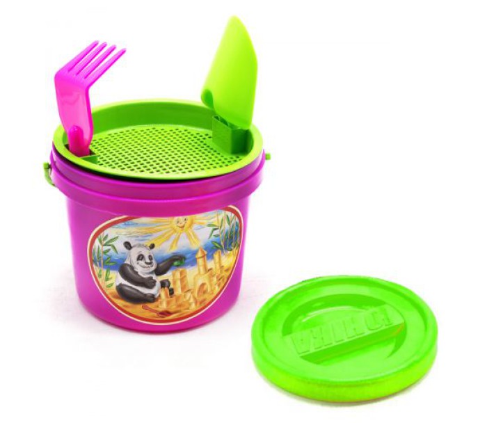 Яскравий пісочний набір. У комплекті: пластикове відерце з барвистою наклейкою і кришечкою (14 х 17 см), ситечко, лопатка і грабельки. Набір ідеально підійде для ігор в пісочку.