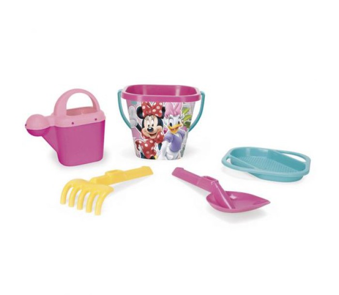Пісочний набір "Мінні Маус". У набір входить: відро (16 х 16 х 15 см), лопатка та грабельки (18 см), сито та лійка. У ситі - 2 додаткові отвори для зручного носіння грабельок та лопатки