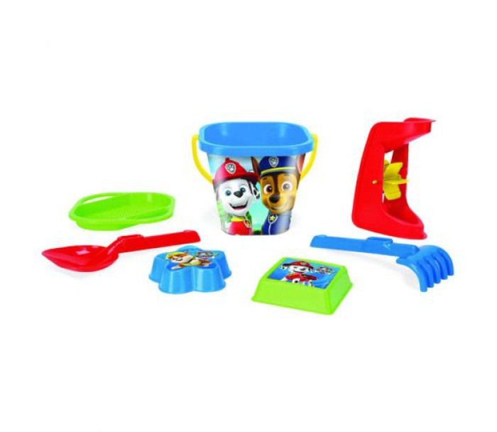 Пісочний набір "Щенячий патруль". У набір входить: відро (16 х 16 х 15 см), лопатка та грабельки (18 см), дві пасочки, сито та млин. У ситі - 2 додаткові отвори для зручного носіння грабельок та лопатки
