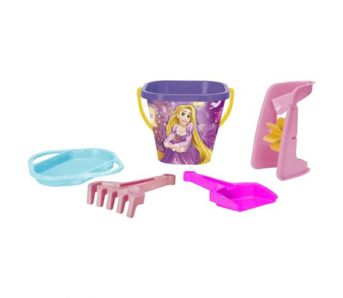 Пісочний набір виконаний з яскравим малюнком принцеси Disney. У комплекті: барвисте пластикове відерце з ручкою (15х16х16 см), лопатка, грабельки, сито та піщаний млин.