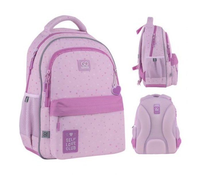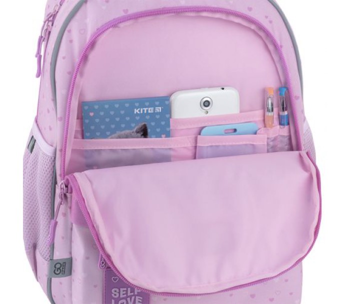 Рюкзак зовні: запатентована ортопедична спинка Ergo Kids; широкі S-подібні лямки; 2 відділення; 1 об'ємна передня кишеня; 2 бічні кишені; світловідбивні елементи; м'яка ущільнена ручка та текстильна петля; знімний нагрудний ремінь; ущільнене дно; зносостійкі блискавки; надійна фурнітура.
