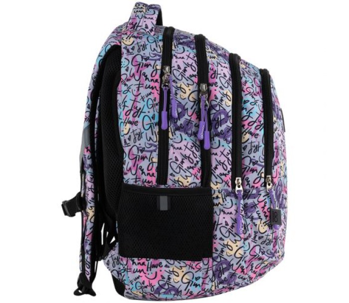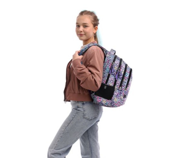 Рюкзак зовні: анатомічна спинка; широкі S-подібні лямки; 3 відділення; 1 об'ємна передня кишеня; 2 бічні кишені; світловідбивні елементи; м'яка ущільнена ручка та текстильна петля; знімний нагрудний ремінь; ущільнене дно; зносостійкі блискавки; надійна фурнітура. Рюкзак всередині: роздільники з фіксуючою резинкою; органайзер, міцна підкладка. Декор: сублімаційний друк