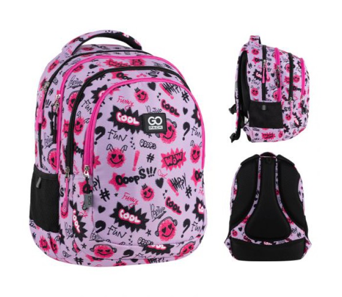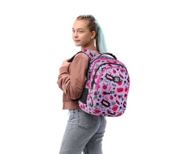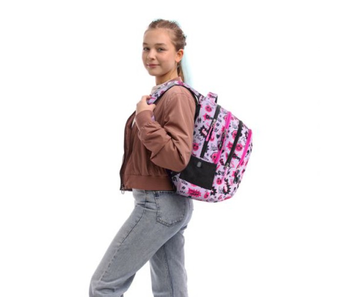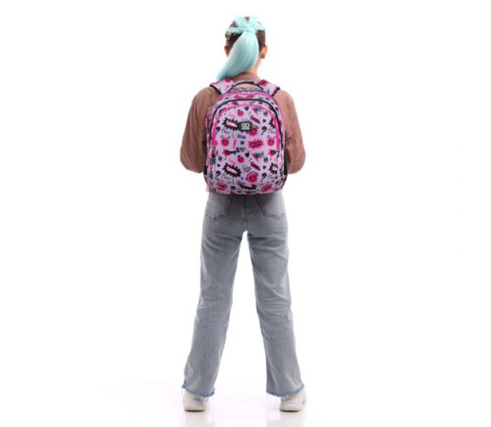 Рюкзак зовні: анатомічна спинка; широкі S-подібні лямки; 3 відділення; 1 об'ємна передня кишеня; 2 бічні кишені; світловідбивні елементи; м'яка ущільнена ручка та текстильна петля; знімний нагрудний ремінь; ущільнене дно; зносостійкі блискавки; надійна фурнітура.