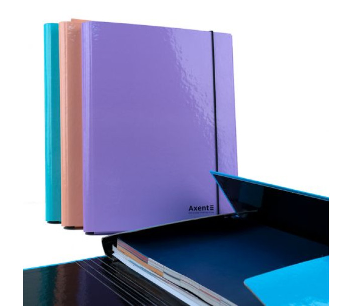 Папка на гумках виготовлена з цупкого картону, що передбачає її зносостійкість і збереження презентабельного вигляду в процесі використання. Корінці і клапани папки можуть розширюватися і звужуватися при необхідності на кілька рівнів (від 4 мм до 35 мм), адаптуючи папку під товщину вмісту і роблячи її місткою. Еластична гумка тримає папку щільно закритою.