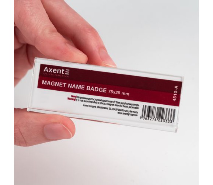Бейджі незамінні при проведенні конференцій, нарад, тренінгів, а також для співробітників, які постійно взаємодіють з великою кількістю людей. Бейдж може стати візитною карткою співробітника і компанії в цілому. Бейджі Axent поєднують в собі надійність, зручність і презентабельний зовнішній вигляд. Бейдж виготовлений з акрилу. Бейдж можна закріпити за допомогою магніту. Розмір бейджа: 75x25 мм.