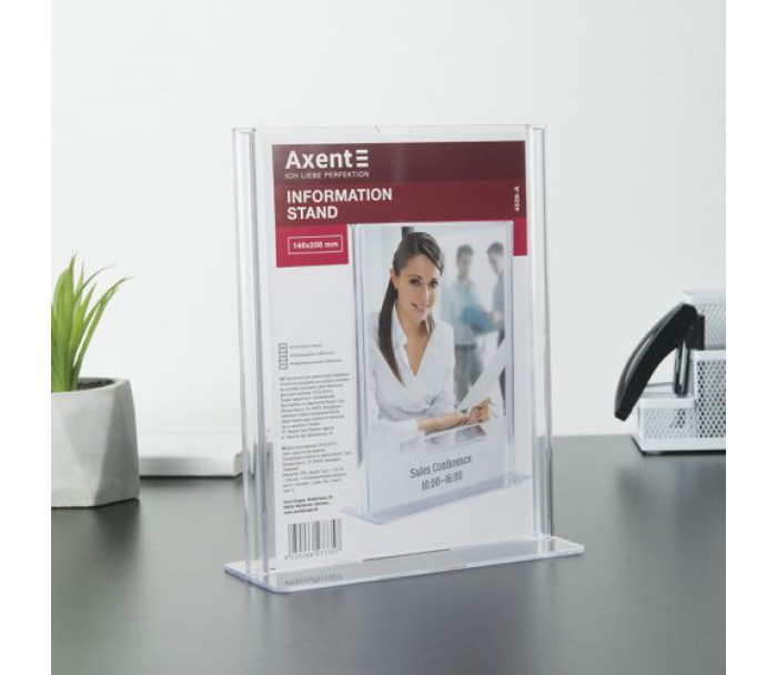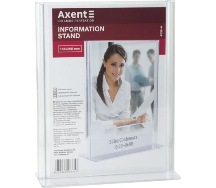 Двосторонні інформаційні таблички широко використовуються для розміщення реклами та іншої інформації при роботі з клієнтами - в банках, ресторанах (наприклад, спеціальні меню), на рецепції готелів, в салонах краси і т.д. Табличка інформаційна двостороння Axent виготовлена з кришталево прозорого пластику (полістиролу), який не порушує передачу кольору і чіткість зображень. Зручна виїмка для пальців дозволяє легко замінити вкладиш в табличці.