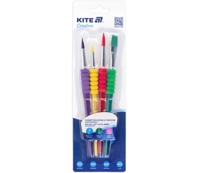 Набір із 4-x пензлів з грипом Kite Creative. Класичні кольори. Алюмінієва обойма, EVA грип, пластикова ручка. Упаковка - блістер.