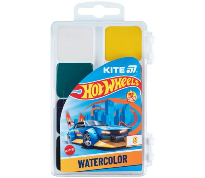 Напівсухі медові акварельні фарби Kitе «Hot Wheels». Фарби містять 8 кольорів в зручній пластиковій упаковці з прозорою кришкою. Кольори яскраві і насичені. Фарби прекрасно змішуються і розмиваються, легко беруться на пензель. Акварелі приємної однорідної текстури, фарби чистого однорідного кольору і рівномірно наносяться на поверхню.