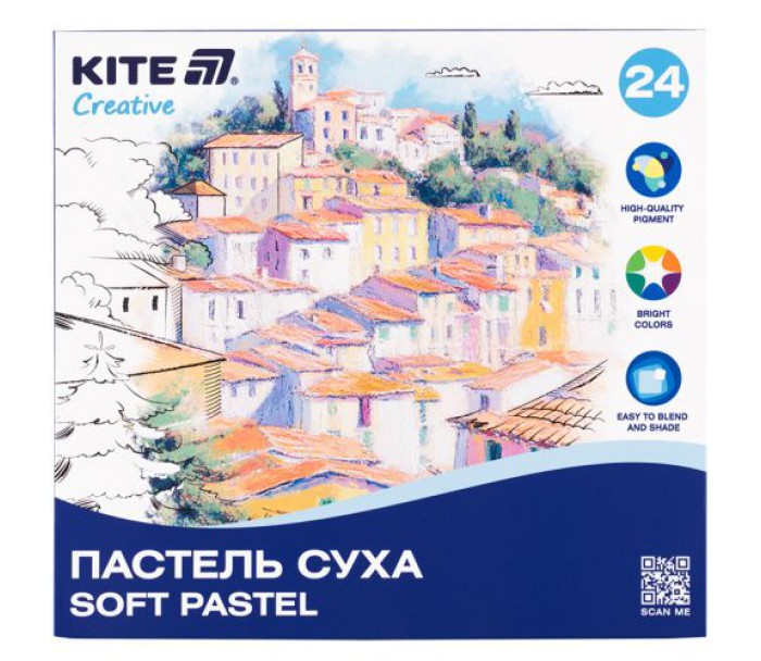 Суха пастель зберігається в яскравій картонній упаковці Kite Creative. Палітра складається з 24 кольорів.