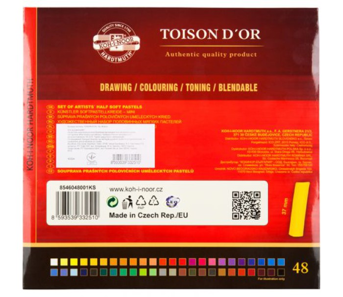 Суха м'яка пастель для художніх робіт. Набір із 48 кольорів. Діаметр 10 мм, довжина 37 мм. Складається в основному з чистого пігменту, з невеликою кількістю сполучної речовини. Висока світлостійкість. Картонна упаковка.