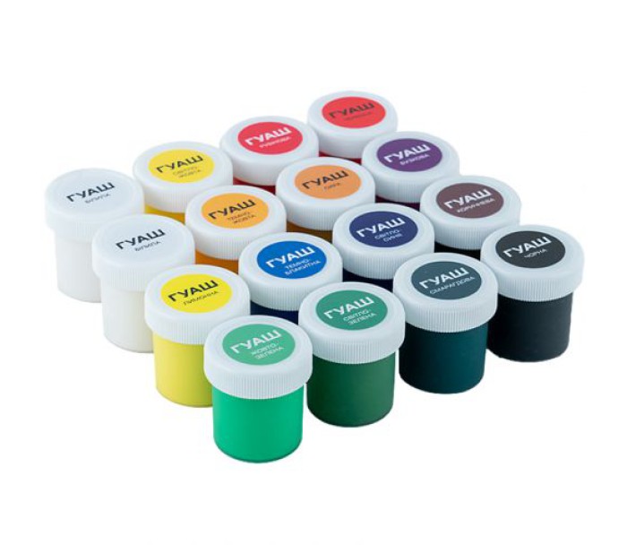 Гуаш Kite містить 16 кольорів. Баночки по 20 мл зберігаються в картонній упаковці.