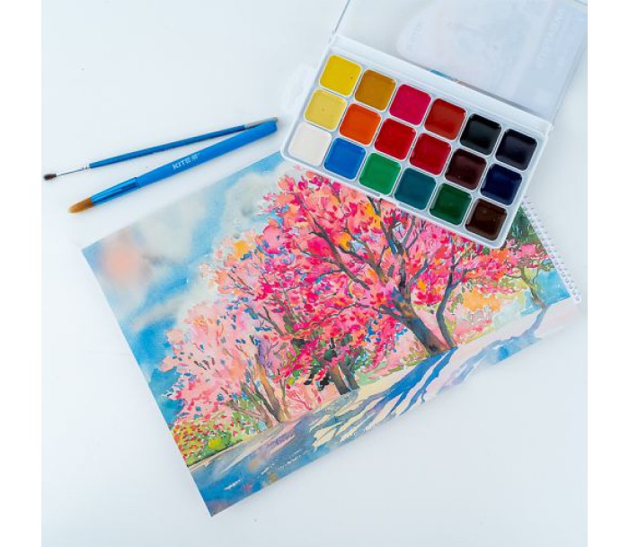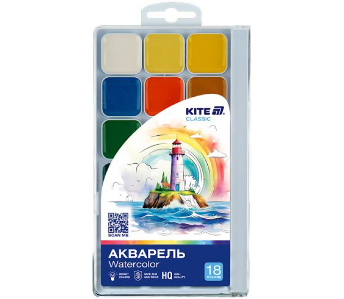 Напівсухі медові акварельні фарби Kitе. Фарби містять 18 кольорів в зручній пластиковій упаковці з прозорою кришкою. Кольори яскраві і насичені. Фарби прекрасно змішуються і розмиваються, легко беруться на пензель. Акварелі приємної однорідної текстури, фарби чистого однорідного кольору і рівномірно наносяться на поверхню.