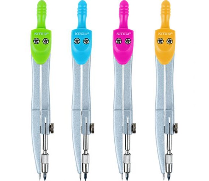 Ніжки циркуля виконані в кольорі сірий металік, а пластикові деталі пофарбовані в яскраві кольори. В асортименті представлені рожевий, блакитний, салатовий і жовто-гарячий кольори.