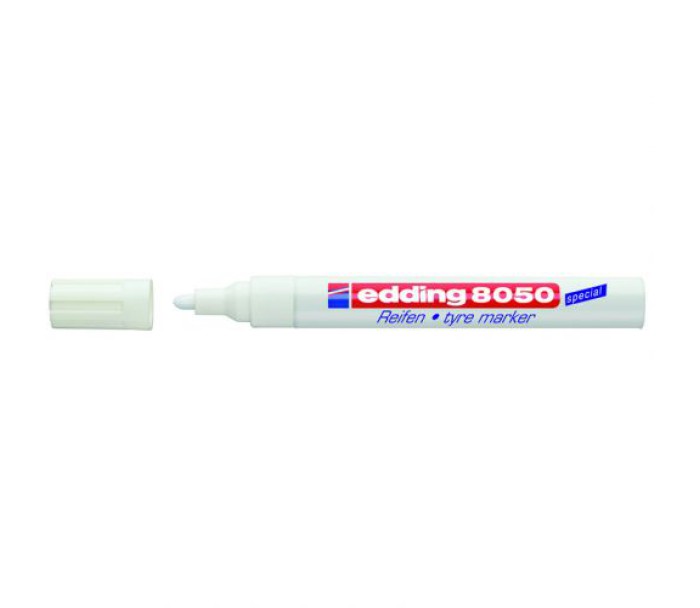 Універсальний маркер e-8050 служить для нанесення маркування практично на будь-які вироби з гуми. Чорнило містить спеціальні присадки, які дозволяють нанесеному маркуванню добре триматися на гумовій поверхні, не обсипатися. При нанесенні чорнило edding не розмазується, не розтікається, швидко сохне. Світлостійке чорнило маркера практично без запаху, еластичне. Після нанесення маркування стійке до механічного стирання. Маркер e-8050 ідеально підходить для нанесення маркування на автошини. Даний маркер рекомендується використовувати у спеціальних сезонних сховищах автошин і в автомайстернях. Ширина сліду 2-4 мм. Колір чорнила: білий. Інструкція з використання Кілька разів струсіть маркер з закритим ковпачком. Відкрийте ковпачок, поставте маркер пишучим наконечником на папір або іншу поверхню і злегка натискайте на пишучий наконечник - до тих пір, поки чорнило не заповнить наконечник маркера.