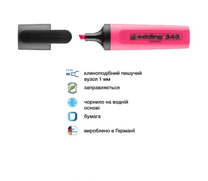 залишає, чіткий, яскравий, насичений, слід, підходить, для, видів, паперу, чорнило, водній, основі, слід, передається, факсу, просочується, крізь, папір, не, розмазує, текст, роздрукований, струменевому, принтері, або, написаний, чорнилом, клиноподібний, пишучий, вузол, ширина, сліду, колір, чорнила, рожевий, edding, e-345/09