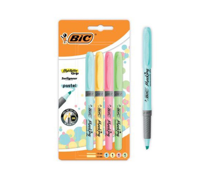 Набір із 4 маркеров BIC Highlighter Grip Pastel з ребристим гумовим тримачем для додаткового комфорту та бездоганного виділення. Маркери мають модульне загострене перо, яким можна виділяти товстою жирною лінією або підкреслювати тонкою і точною. Завдяки передовій технології проти висихання ручка BIC Highlighter Grip Pastel може залишатися без ковпачка до 8 годин.Чорнило на водній основі не розтікається по паперу і відмінно підходить для ксерокопій.