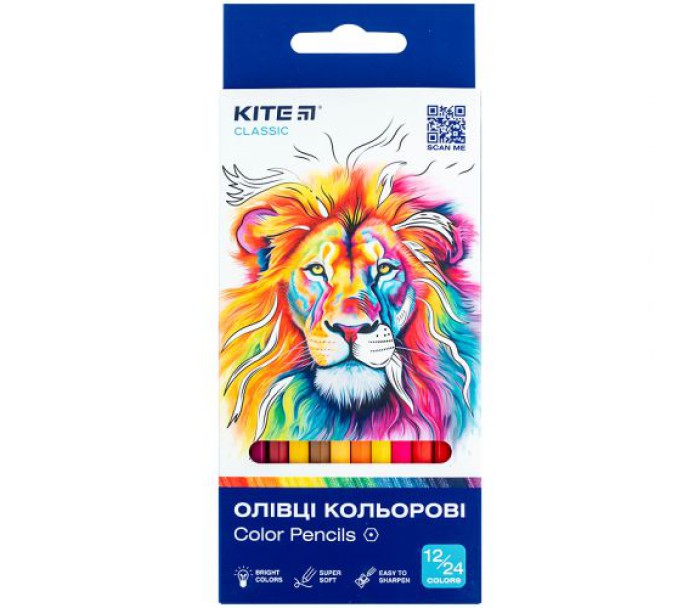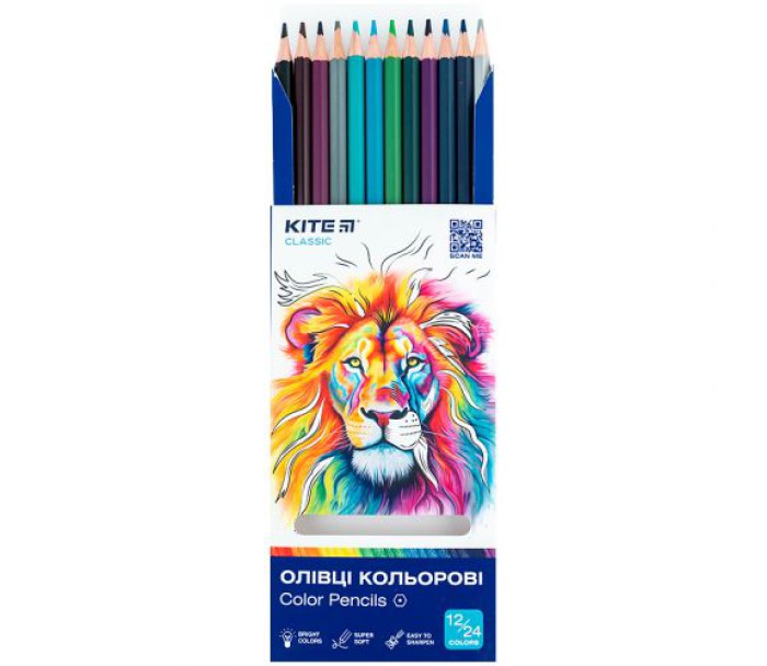 Кольорові двосторонні олівці Kite в картонній упаковці. Дванадцять олівців мають 24-кольорову палітру, їх компактно зберігати в пеналі і рюкзаку дитини. Дитячі олівці малюють м'яко, при легкому натисканні дитина легко отримає яскраву картинку. Грифель товщиною в 3 мм малює плавно, не кришиться і не дряпає папір. Олівці при заточуванні або падінні не ламаються і не кришаться. Кольорові олівці виготовлені з міцної натуральної деревини. Олівці покриті лаком в тон кольору грифеля, який запобігає розсиханню і появі тріщин на корпусі. Довжина виробу 175 мм. Набір олівців Kite рекомендований для дошкільнят і школярів.