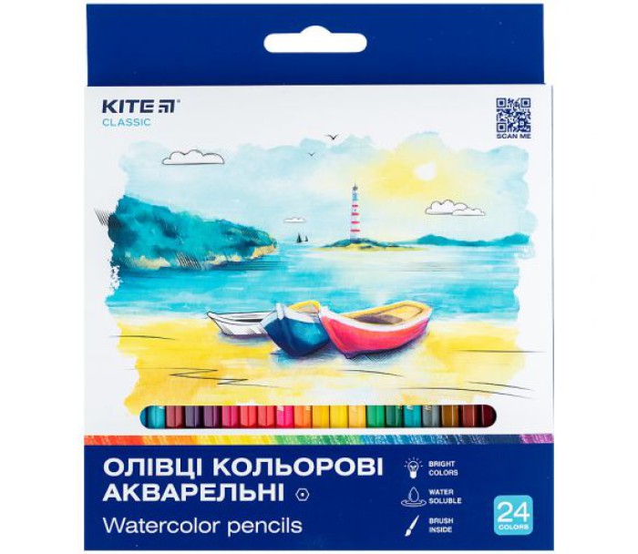 Кольорові акварельні олівці Kite в картонній упаковці з пензликом. Двадцять чотири олівці мають гармонічну палітру, їх компактно зберігати в пеналі і рюкзаку дитини. Акварельні олівці поєднують властивості акварельної фарби і кольорового олівця. По малюнку, виконаному акварельними олівцями, досить провести мокрим пензлем і ми отримаємо справжній акварельний малюнок.