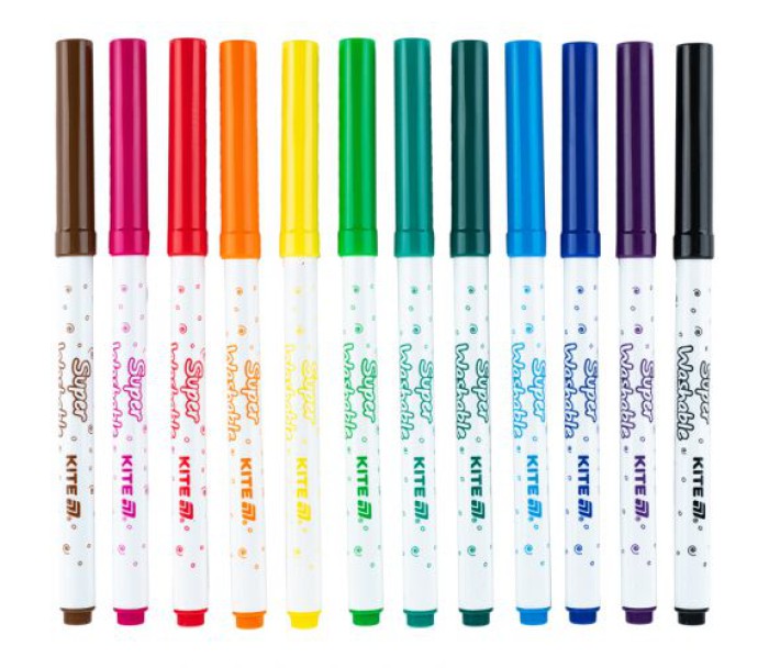 Фломастери Kite Creative: • набір із 12 фломастерів; • конусоподібний пишучий вузол для тонких та широких ліній; • суперзмивні чорнила, які легко змиваються водою; • надійно закріплений пишучий вузол для зручного малювання різних елементів; • зручна слайдер-упаковка для легкого зберігання та транспортування.