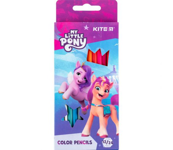 Кольорові двосторонні олівці Kite в картонній упаковці. Дванадцять олівців мають 24-кольорову палітру, їх компактно зберігати в пеналі і рюкзаку дитини.