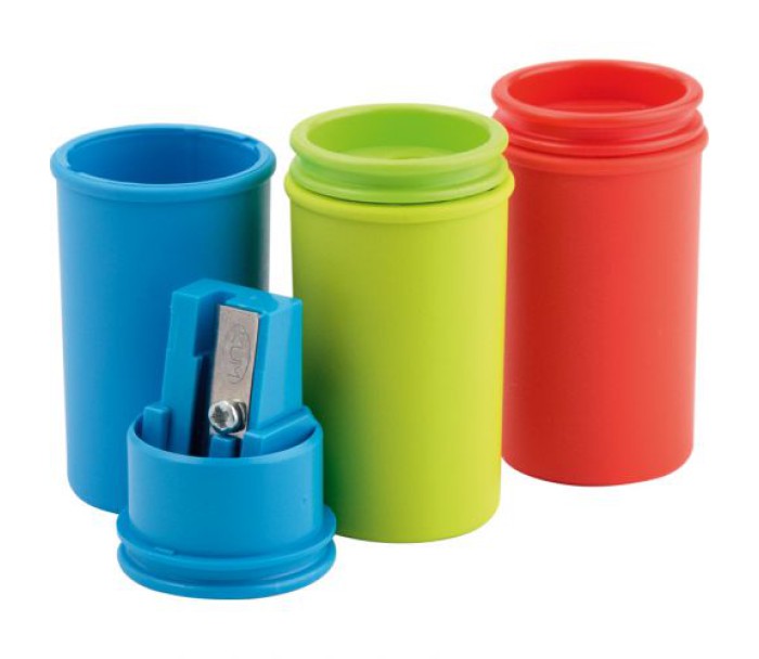 Пластикова одинарна точилка KUM з міні-контейнером. Яскраві кольори сподобаються і школярам, і дорослим. Упаковка - прозора банка, яка буде мати привабливий вигляд і на полицях, і в прикасових зонах. Застосовується для заточування кольорових і графітних олівців діаметром до 8 мм круглої, шестигранної, трикутної форми.