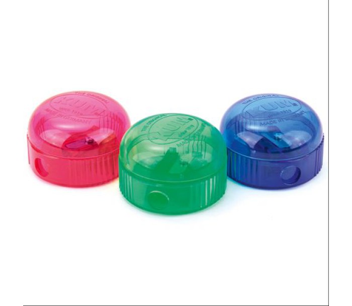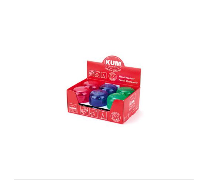 Пластикова точилка KUM з контейнером. Застосовується для заточування кольорових і графітних олівців діаметром до 8 мм круглої, шестигранної, трикутної форми. Отвір закривається. Надгострі вигнуті леза легко заточують олівці. Корпус з первинного пластику дуже міцний і виконаний максимально точно. Леза захищені від іржі. Асорті кольорів.