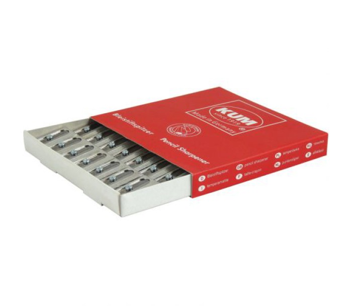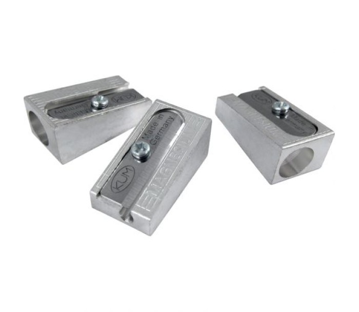 Металева точилка KUM з корпусом з магнієвого сплаву. Клиноподібна форма. Надгострі вигнуті леза з легкістю заточують будь-які олівці, навіть олівці поганої якості. Леза і корпус захищені від іржі. Висока точність обробки.