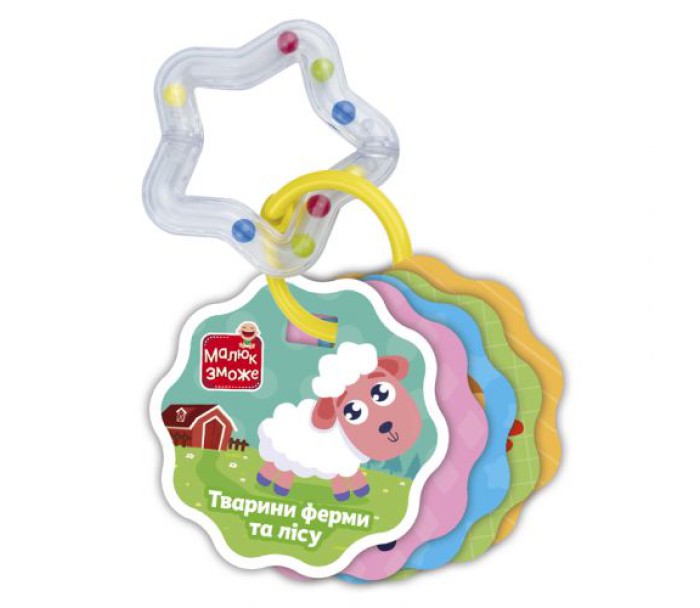 Іграшка-набір, що складається з 6-ти карток з яскравими картинками та прозорого брязкальця, всередині якого видно різнокольорові кульки. Картки та брязкальце скріплені кільцем, яке можна зняти або прикріпити картки до коляски або ліжечка за його допомогою. Граючи з картками, дитина зможе тренувати логічне мислення, дрібну моторику рук, памʼять та уяву. Виконані із міцного картону.