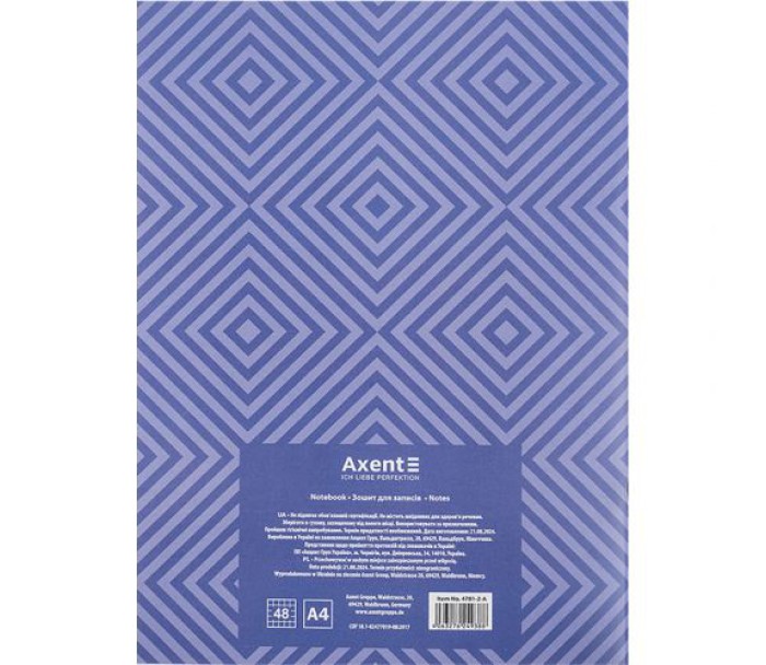 Зошит для записів Axent призначений для щоденних записів, ведення обліку, замальовки схем, графіків, фіксації великого обсягу інформації. М'яка обкладинка, кріплення на скобі. Білий папір в клітинку забезпечує комфортне письмо. Щільність паперу 55г/м2. Формат - стандартний, А4. Кількість аркушів - 48 в клітинку. Обкладинка: мелований картон щільністю 230 г/м² . Плашка для підпису на фронтальній обкладинці.