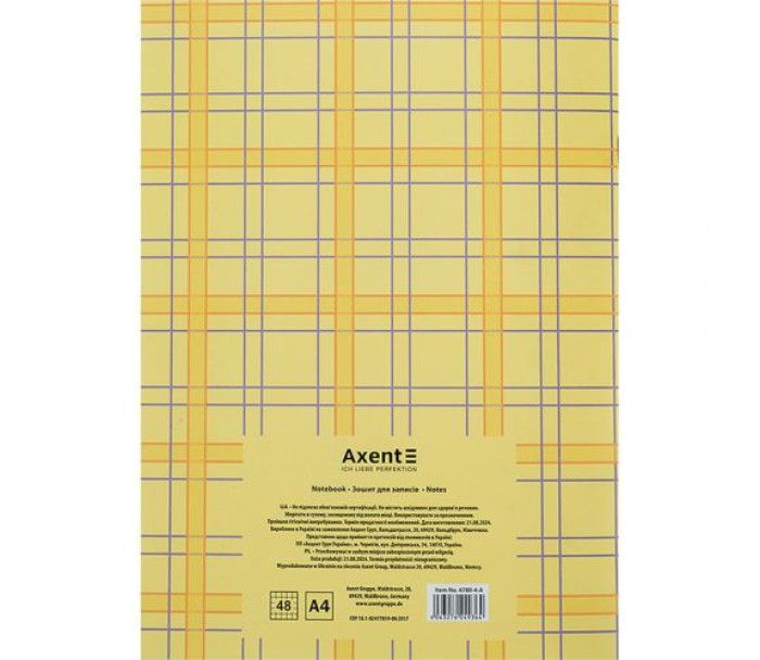 Зошит для записів Axent призначений для щоденних записів, ведення обліку, замальовки схем, графіків, фіксації великого обсягу інформації. М'яка обкладинка, кріплення на скобі. Білий папір в клітинку забезпечує комфортне письмо. Щільність паперу 55г/м2. Формат - стандартний, А4. Кількість аркушів - 48 в клітинку. Обкладинка: мелований картон щільністю 230 г/м² .