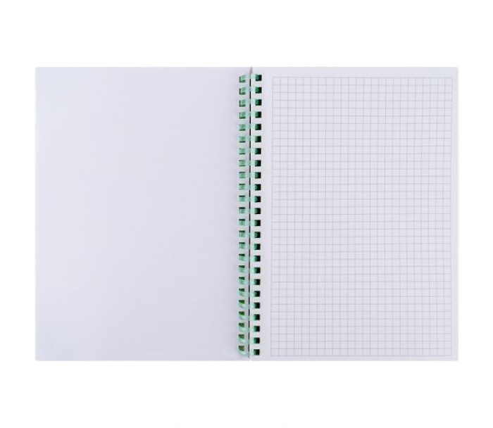 Має картонну обкладинку та фіксуючу резинку. Містить білі аркуші паперу щільністю 70г/м2 у клітинку . Формат - середній, А5. Кількість аркушів - 80.