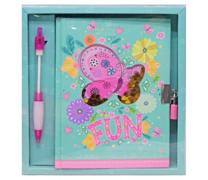 Симпатичний подарунковий набір з яскравим блокнотом на замочці та ручкою. На обкладинці блокнота є прозоре віконце, через яке видно кишеньку з золотистими блискітками. Закривається на замочок, у комплекті є два ключики. 56 аркушів у лінію. Розмір блокноту 19х10 см.